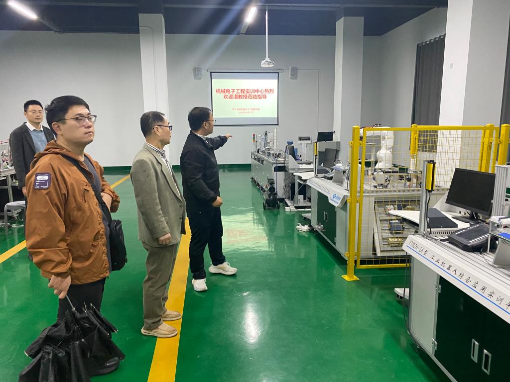 在物理实验室,湛教授重点观摩了电工电子实验平台,对学院将现代技术与传统实验结合的教学模式表示赞赏。在机械电子工程实训中心,学生自主研发的智能机器人、3D打印工作站及工业自动化生产线模拟平台引发了湛教授的浓厚兴趣,他现场与学生交流相关经验。最后,湛教授参观了汽车工程实训中心,特别对新能源动力系统拆解平台、汽车传感器研发平台产生了浓厚的兴趣,他结合自身研究方向,就“双碳”背景下汽车轻量化材料应用与学院教师展开深入探讨。