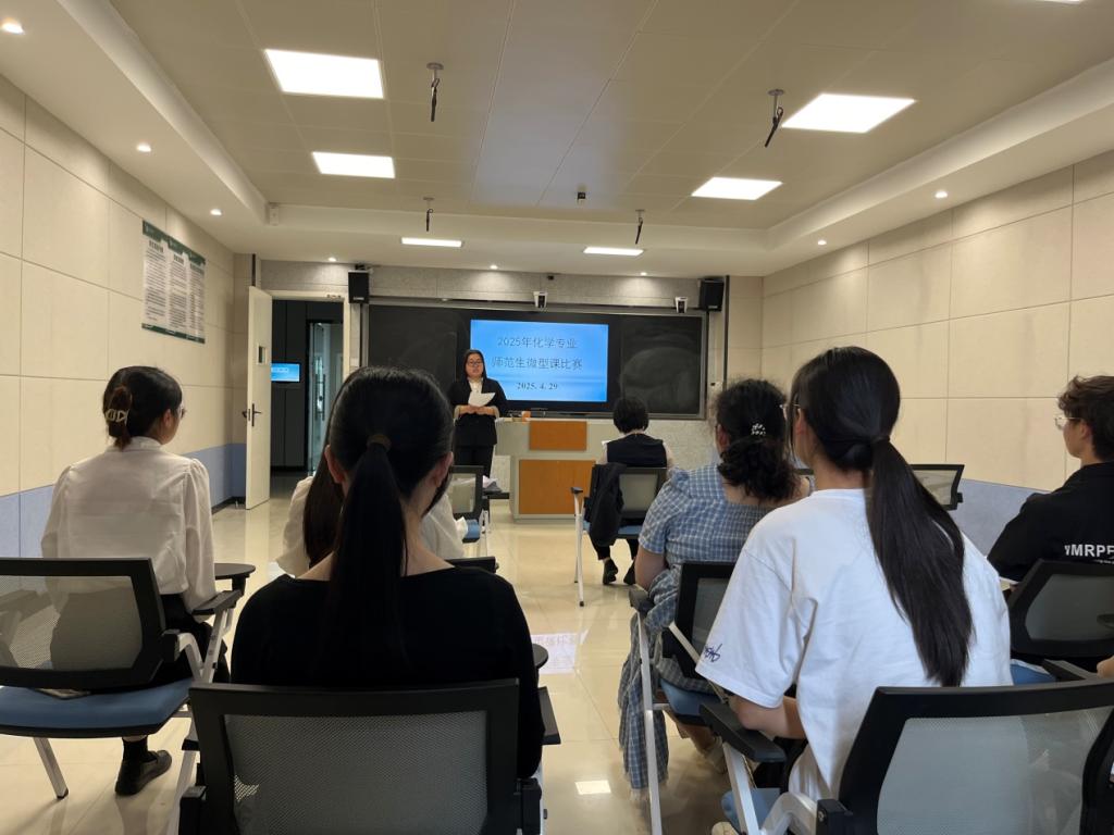 为提升师范生的教学设计与实施能力,促进教育理论与教学实践的有机结合,化学专业于4月29日下午举行了师范生微型课比赛。比赛分为两个组,分别在实训中心316、318进行。本次比赛由22级化学1班毕超洋和2班吝立两位同学主持,化学专业教师张秋平、马艳梅、吴艳玲、王倩倩、张艺、刘慧丽担任评委。