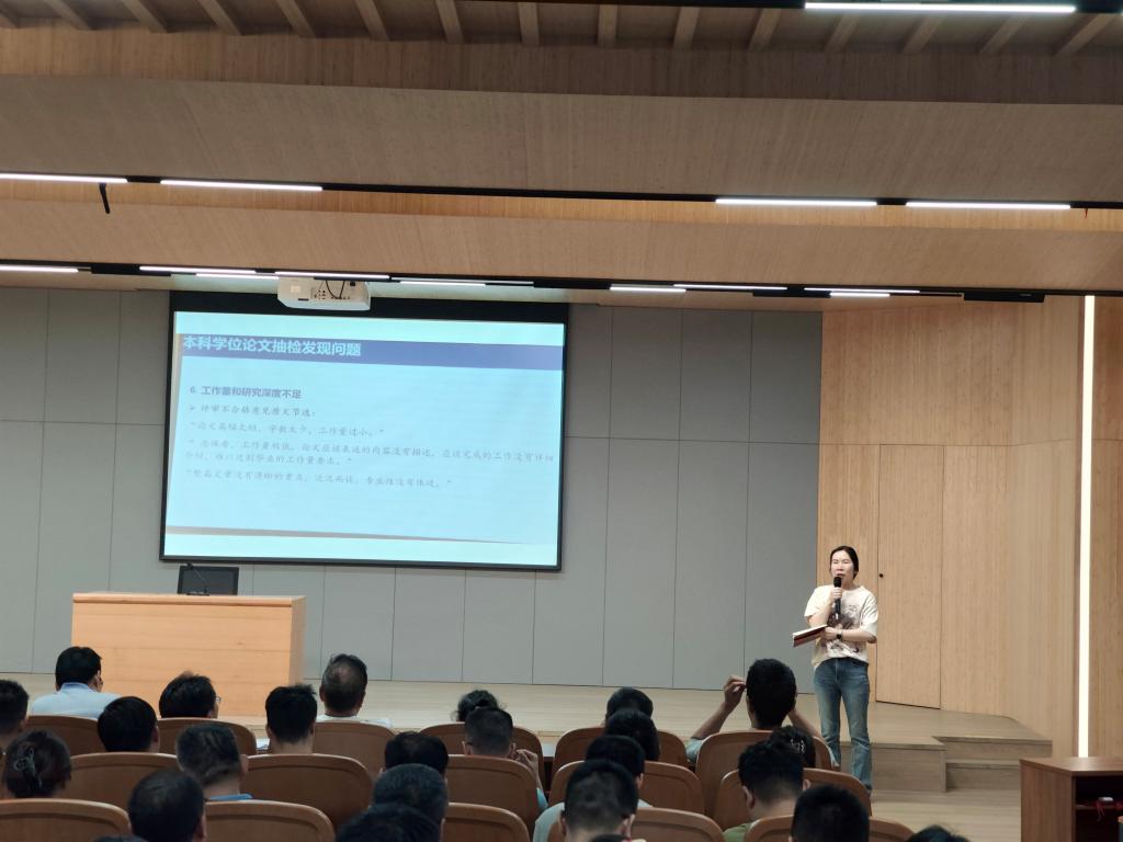 会上,教学副院长李晓严首先向大家讲解了全国毕业论文抽检工作的流程和规则,并且强调了抽检结果对于学校学院发展以及指导教师、学生的重要意义。之后,李副院长便将9428cn太阳集团2024届5个专业被抽检到的9篇论文的反馈结果逐条向大家展示并讲解,虽然9篇论文均通过抽检的考验,但是在格式、内容、选题以及图表细节上暴露的问题仍然值得各位指导教师在接下来的工作中重点关注并完善。同时李副院长又向大家集中展示了在河南省学位论文质量监测工作会上所反应的毕业论文问题。