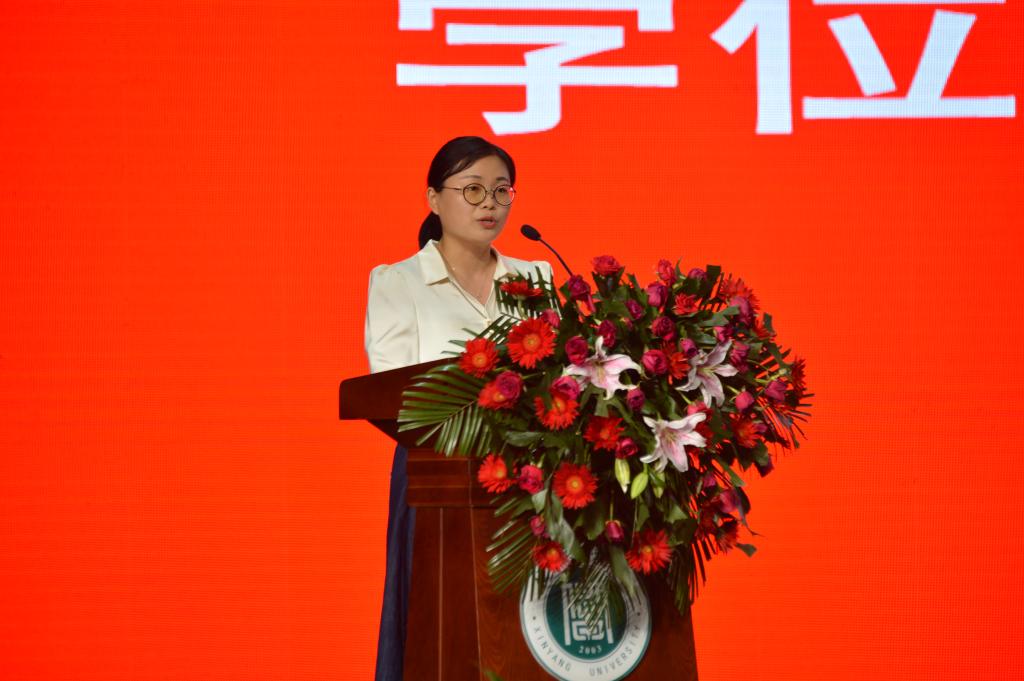 教师代表董玉静博士发言,她对2023届毕业生表示热烈的祝贺,嘱咐每一位毕业生保持顽强的意志、坚韧不拔的精神、积极乐观的态度,要大胆地去尝试,执着地去坚持,果断地去放弃,在不断学习,不断积累的过程中强大自己。