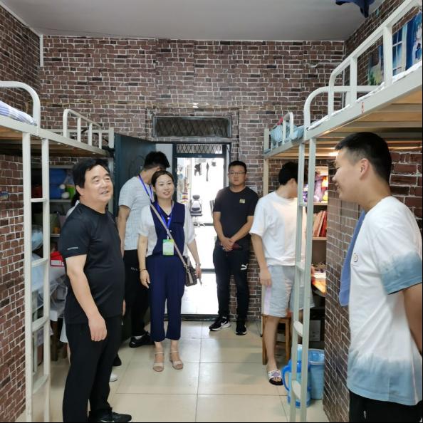 6月26日上午,校党委书记褚金海、校党委办公室主任娄琪、党办杨浩然老师等在9428cn太阳集团党总支副书记张红梅、学工秘书杨晓杰、辅导员徐国文陪同下,深入学生7号楼公寓走访学生,实地查看学生宿舍安全、文明、卫生等情况。