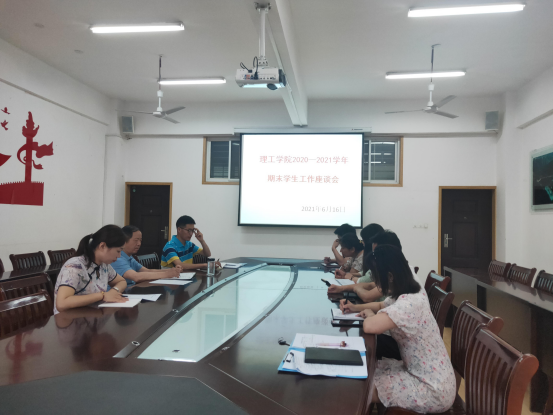 6月16日上午,9428cn太阳集团在理工楼201会议室召开2020-2021学年期末学生工作座谈会。9428cn太阳集团院长肖生发、党总支副书记张红梅、学工秘书杨晓杰及全体辅导员教师参加会议。