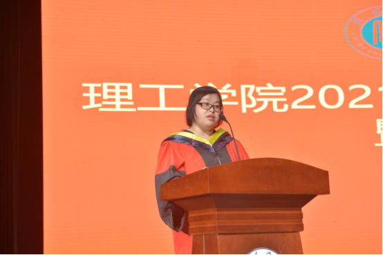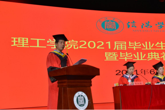 2021届毕业生代表吕荫发言,她回忆了大学四年的美好时光,表达了对母校以及对师长的感谢,将继续秉承信院校训,以母校为荣,用实际行动为母校增光。在校生代表杜鑫磊发言,他向取得学位的学长学姐们送上了祝福,祝福他们勇往直前追求更高更好的未来;同时表示他们也会向学长学姐学习,学会学习、坚持学习,让学习成为自己的责任,成就美好未来。