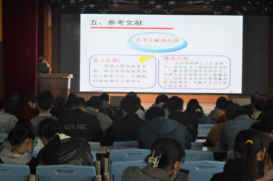 张秋平博士通过论文结构、摘要撰写、拟定关键词、结论撰写、参考文献、论文撰写六个部分,细致的讲述了毕业论文的写作方法和写作的具体要求。通过论文的基本组成部分:标题、摘要、关键词、目录、前言、正文、结论、参考文献、附录,论文的主体部分:引论、本论、结论,常见的论文类型:实验研究型论文、历史研究型论文、理论研究型论文、文献综述型论文、调查研究型论文以及实践应用型论文,摘要的要求、内容以及注意事项,论文其他组成部分的内容要求和注意事项,让全体学生再一次明晰了毕业论文的写作重点和注意事项。讲座的最后,张秋平博士建议同学们写论文从模仿开始,提醒毕业生们可以参照别人的论文模板让自己的论文精益求精,但严禁抄袭、原文照搬。