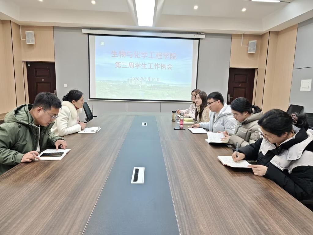 为扎实推进学生工作,筑牢校园安全防线,明确后续工作重点、压实工作责任,3月16日上午,生物与化学工程学院在理工楼201会议室召开2026年春季学期第三周学生工作例会。学院党总支书记赵佳、学工干事邓先强及全体辅导员参加会议。