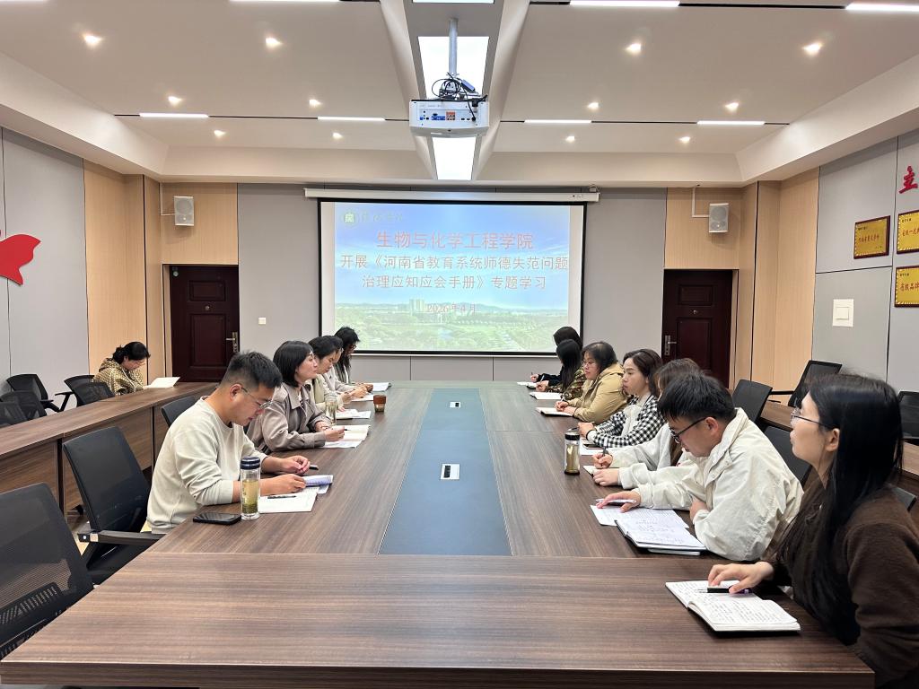 为深入推进师德师风建设,规范教师从教行为,强化教师责任意识,4月15日,生物与化学工程学院组织开展《河南省教育系统师德失范问题治理应知应会手册》专题学习活动,学院班子、各教研室主任及全体辅导员参加学习。