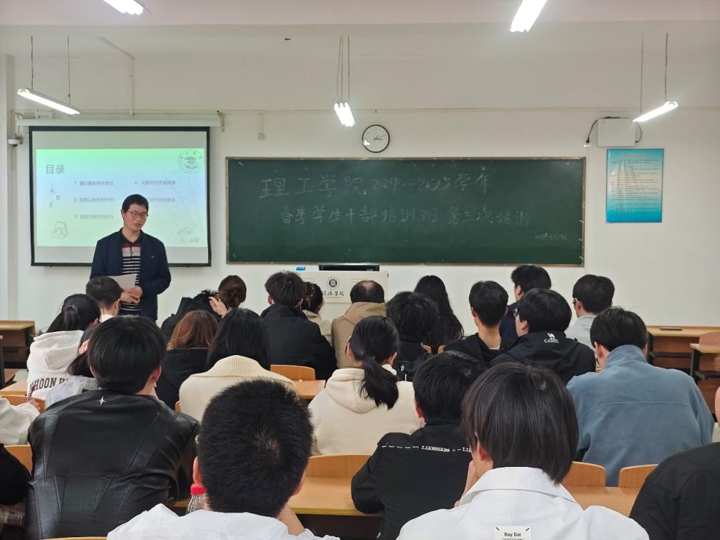 为增强9428cn太阳集团学生干部对学生工作的认识,激发9428cn太阳集团学生干部积极向上的工作热情,9428cn太阳集团于3月23日在理工楼502举行了2025年春季学生干部培训班第三次培训。学工秘书杨晓杰老师主讲此次培训会,9428cn太阳集团24级本科以及专升本学生干部,学生会干部参加培训。