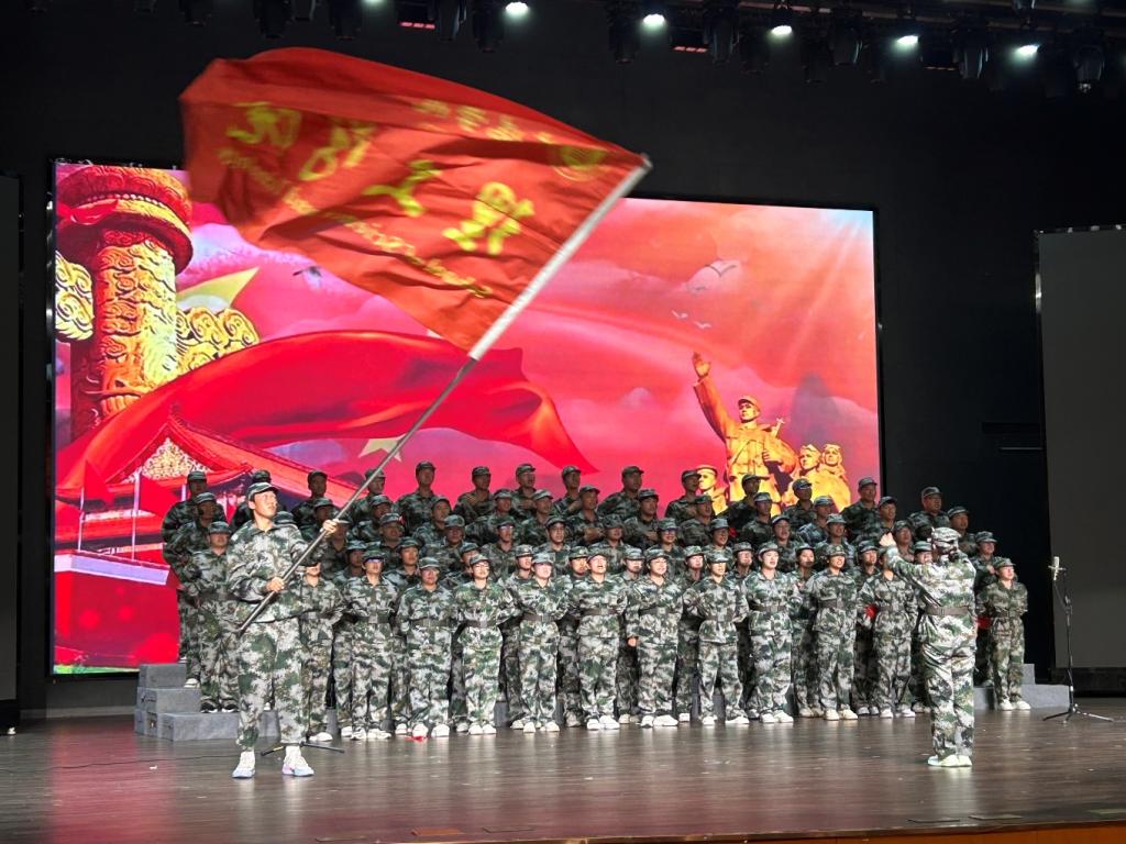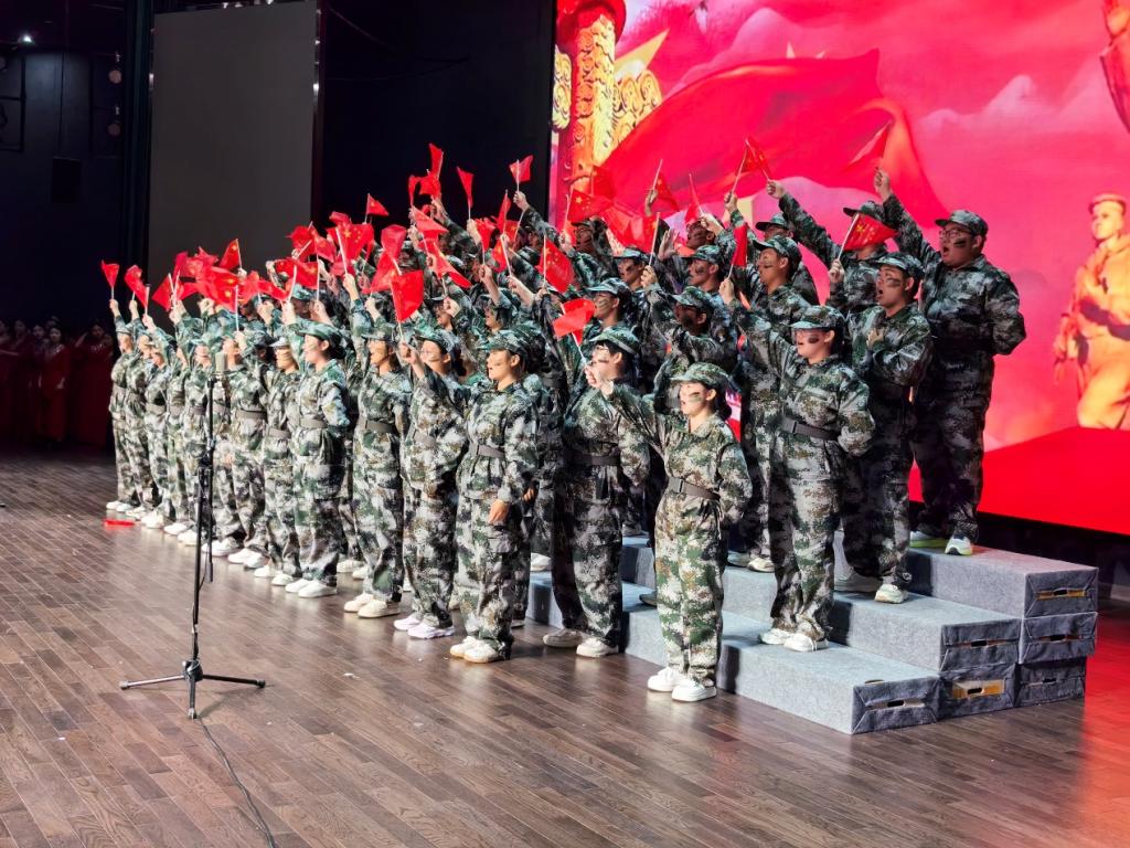 红歌比赛现场气氛热烈,身着军训服的同学们以激昂演唱惊艳全场,用嘹亮歌声诠释《强军战歌》的磅礴力量。脸颊上勾勒的迷彩纹路,为青春面庞增添了几分英气,手中挥舞的红旗如跳动的火焰,成为舞台上最亮眼的色彩。