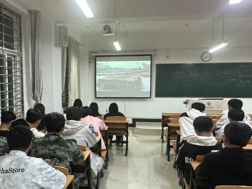 当晚,同学们提前入座,目光始终聚焦前方屏幕。随着大阅兵画面正式切入,所有同学不约而同地抬起头、挺直脊背,以最端正的姿态投入观影。在整个观看过程中,同学们被整齐威武的受阅方队、先进精良的武器装备深深震撼。同学们围绕观看感受展开热烈交流,纷纷拿出手机记录下这些令人自豪的瞬间,用最朴素的方式表达对祖国的热爱与对英雄的崇敬。