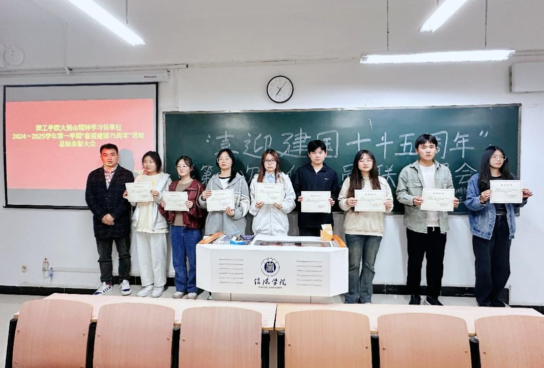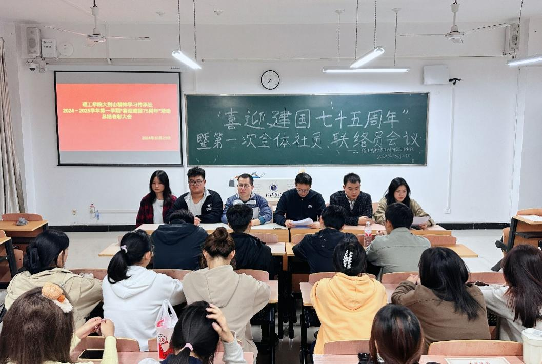 为弘扬大别山红色精神,赓续红色基因,10月23日夜晚,9428cn太阳集团在理工楼605教室隆重举行“喜迎建国75周年”活动总结表彰大会。大别山精神学习传承社副社长杨晓杰、甘玉锋出席会议,全体社员、各班联络员及各班获奖学生代表参加了本次会议。本次会议由田亚星老师主持。