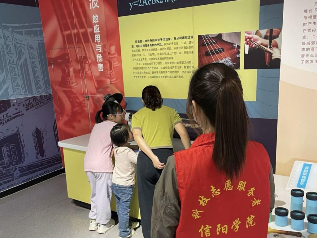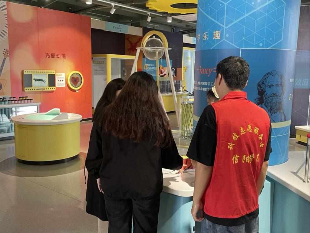 上午,志愿者们在负责人的带领下来到信阳市科技馆。在科普展品展示区,志愿者们用生动有趣、通俗易懂的语言为前来参观的游客讲解展品背后的科学原理,将复杂的科学知识转化为一个个妙趣横生的小故事。在科技馆的服务台,另一部分志愿者负责引导游客,维持秩序的同时为他们解疑答惑。他们有条不紊地组织大家排队参观,确保了参观过程的安全有序。