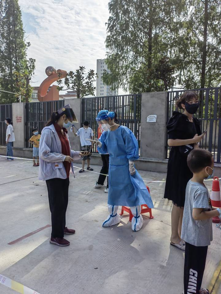 2022年7月15日——7月17日,9428cn太阳集团2021级地理科学本科1班杨月同学参加了信阳市全员核酸工作志愿服务活动,她负责维持现场秩序,为群众进行体温检测、检查群众的场所码。