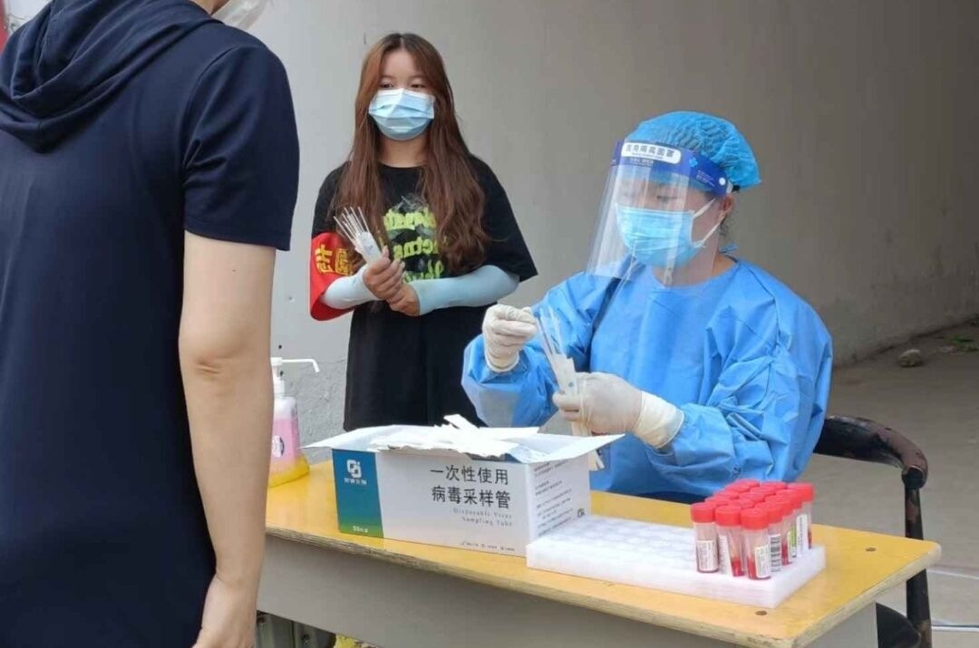 2022年7月13日,9428cn太阳集团2020级化学本科3班潘雅静同学负责维持核酸检测场所秩序,帮助工作人员核查往来人员的健康码。