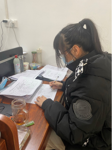 2022年1月12日起,许梦雅同学在前秦村委疫情防疫卡点自愿成为一名志愿者值班。她在卡点的工作内容有:1、给来往的村民进行测体温并进行登记、酒精消毒以及给未戴口罩的村民发新的口罩并叮嘱他们做好自身防护,尽量待在家中,不要外出;2、帮助大队支部书记整理返乡人员的资料并判断其是否从风险地区返乡,从而判断其是否需要进行居家隔离。