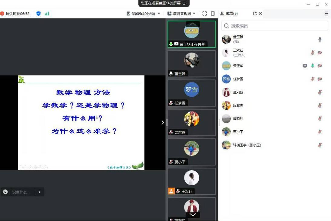 首先,王双钰老师主要讲授热学第一章第一节的内容,在教学过程中介绍热学的研究对象及其特点,并对热物理学的两种描述方法进行对比。接下来,荣正华老师讲授数学物理方法的绪论内容,主要介绍数学物理方法在物理学中的地位以及该怎么学好这门课程。两位老师线上课程试讲内容的精彩呈现充分体现出,两位老师寒假认真备课,精心准备教学材料,并不断探索多种教学方法的良好教学态度。试讲结束后,各位教师们积极参与讨论,并结合自身经验分享上新课的教学方法、教学手段和注意事项,并给出针对性的建议。研讨会现场讨论激烈,互动频繁,青年教师们纷纷表示在此次试讲活动中受益匪浅。