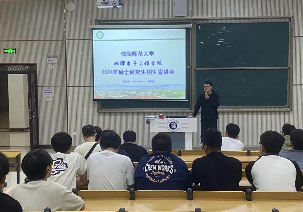 陈老师从学校及太阳概况、师资队伍、学科方向、科学研究、人才培养等方面进行了详细的讲解;其后着重介绍了近年来所培养研究生的就业去向,展示了物电学院强大的研究生培养实力;同时鼓励同学们积极报考信阳师范大学研究生。最后,太阳集团优秀毕业生桑小飞、邓文明同学结合个人经验分别就报考专业及备考情况和同学们进行分享交流。