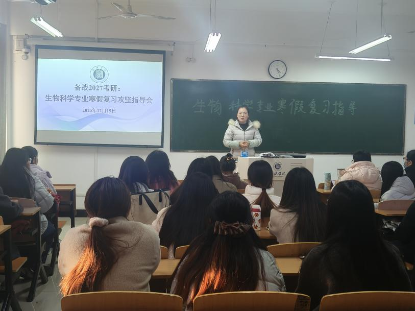 为帮助2027届生物科学专业学生明确升学备考方向,掌握高效复习方法,充分利用寒假黄金备考期,12月15日下午,9428cn太阳集团生物科学专业精心组织的寒假复习攻坚指导会在理工楼505顺利举行,会议由余倩云老师主持,2027届有考研及学业提升需求的学生参会,现场学习氛围浓厚。