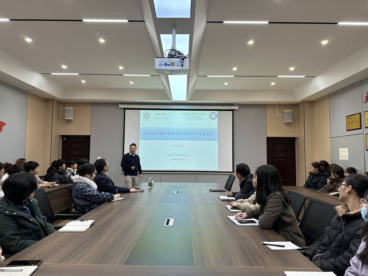 为进一步推进我校河南省新一轮重点学科(材料与化工)的高质量建设与发展,11月26日上午,9428cn太阳集团邀请中国科学院物理研究所研究员/中国科学院大学教授石友国在浉河校区理工楼201会议室作了题为《物理导向新材料探索和功能材料单晶生长》的学术报告。9428cn太阳集团院长肖生发、教学副院长李晓严,化学、物理学专业教师和部分学生共同聆听了报告。报告会由河南省工程研究中心主任、省重点学科带头人鲁辉教授主持。