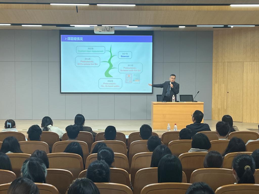 讲座中,李教授介绍了可见光光催化材料的基本概念和发展历程,通过生动有趣的例子,将光催化理论变得通俗易懂。他重点阐述了光催化领域的最新突破,展示了光催化在解决能源问题上的巨大优势。此外,李教授还分享了目前自己在科研过程中的进展和经验感悟,鼓励同学们勇于探索未知,保持对科学的好奇心。在互动环节,同学们踊跃提问,从物理学专业的发展前景,到物理学专业考研注意问题,李教授都一一耐心解答,与同学们展开了深入的讨论,现场气氛热烈。