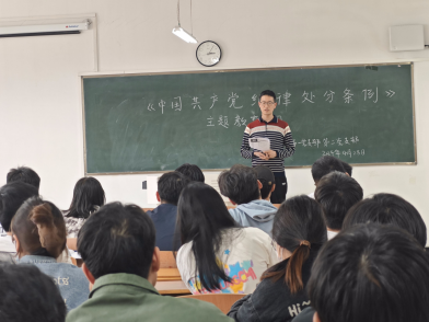 学生第二党支部书记甘玉锋要求全体学生党员要对《中国共产党纪律处分条例》进行系统的学习,认真做好笔记,撰写学习心得体会。要以更高的标准、更严的纪律要求自己,通过不断学习和践行,切实增强纪律意识和规矩意识。