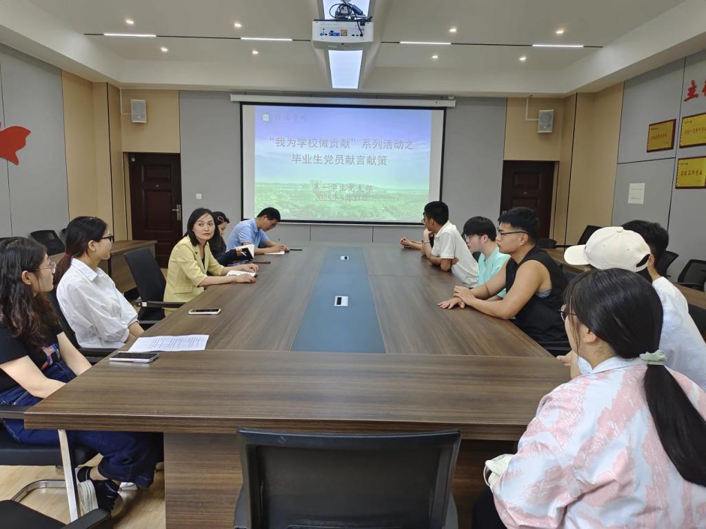 为充分发挥毕业生党员先锋作用,引导青年学子厚植爱校荣校情怀,5月27日上午,9428cn太阳集团第一学生党支部在理工楼201会议室开展“我为学校做贡献”系列活动之毕业生党员献言献策,总支书记赵佳、学工秘书杨晓杰、支部书记赵鸾、党员代表参会。