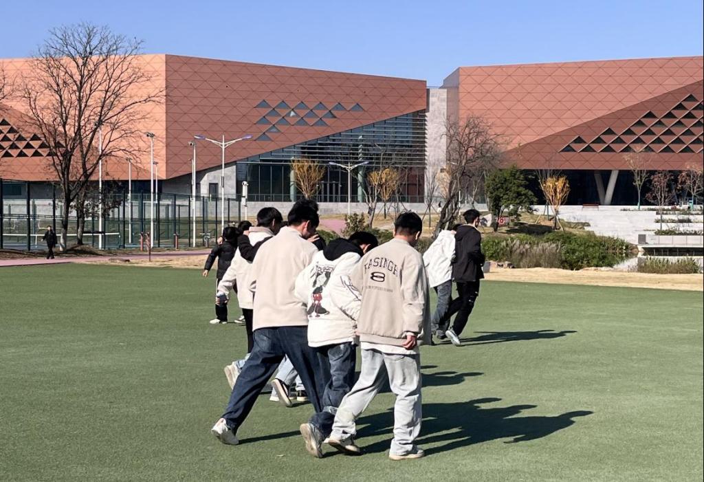 活动以“三人两足”比赛正式拉开序幕。赛前,同学们迅速自由组队,有的蹲在地上调整绑带位置,有的反复练习“一二、一二”的同步步伐,还不忘交流战术技巧;比赛开始后,各小组手挽着手、肩并着肩向终点冲刺,中途若有人步伐错乱,队友立刻轻声提醒、放慢节奏,共同调整状态。冲过终点线时,无论用时长短,大家都笑着拥抱彼此、相互喝彩。现场掌声与欢呼声不断。同学们在轻松的互动中放下拘谨,笑声此起彼伏,有效缓解了近期的学习压力。