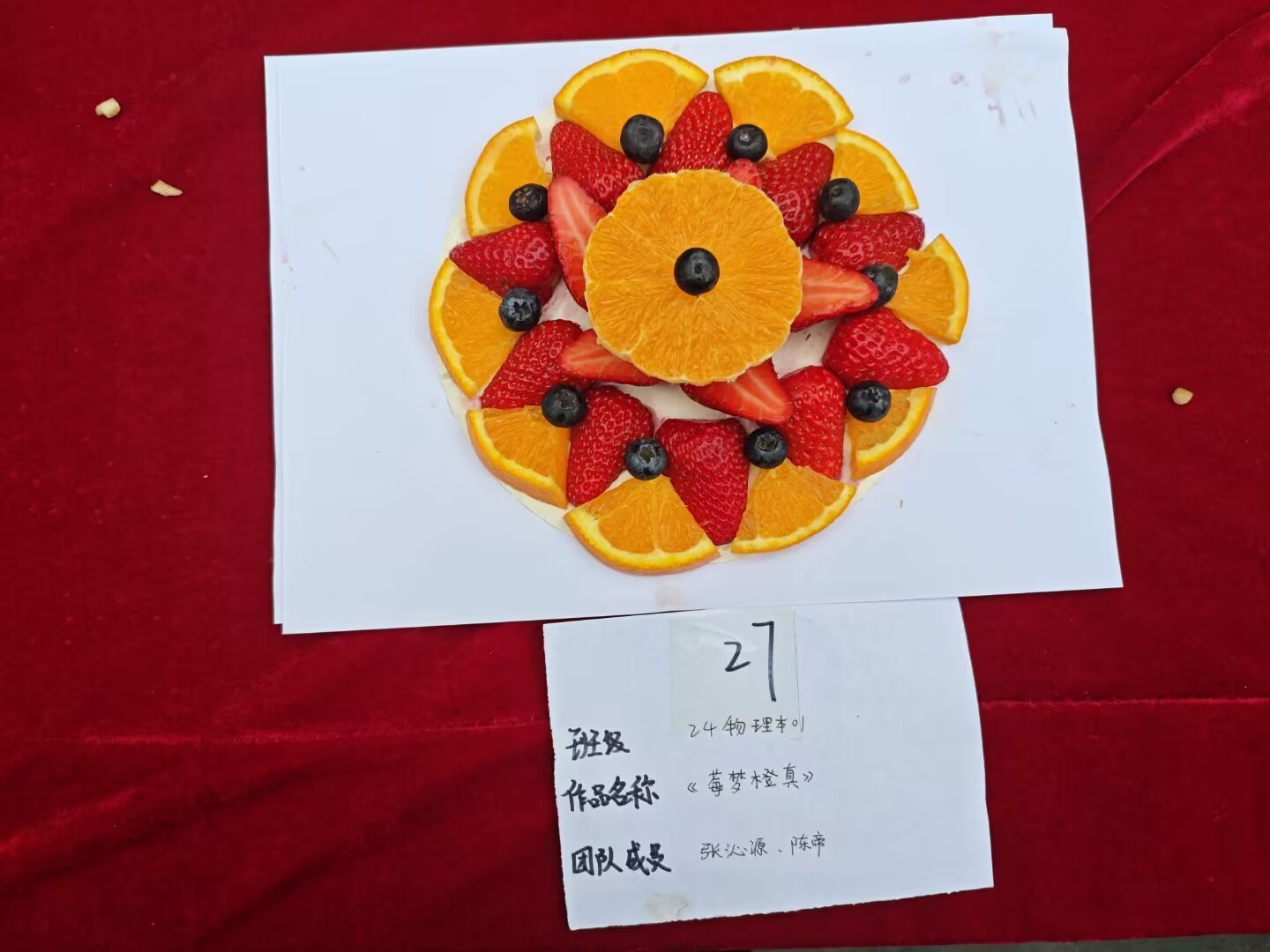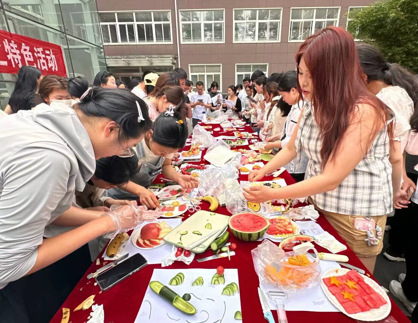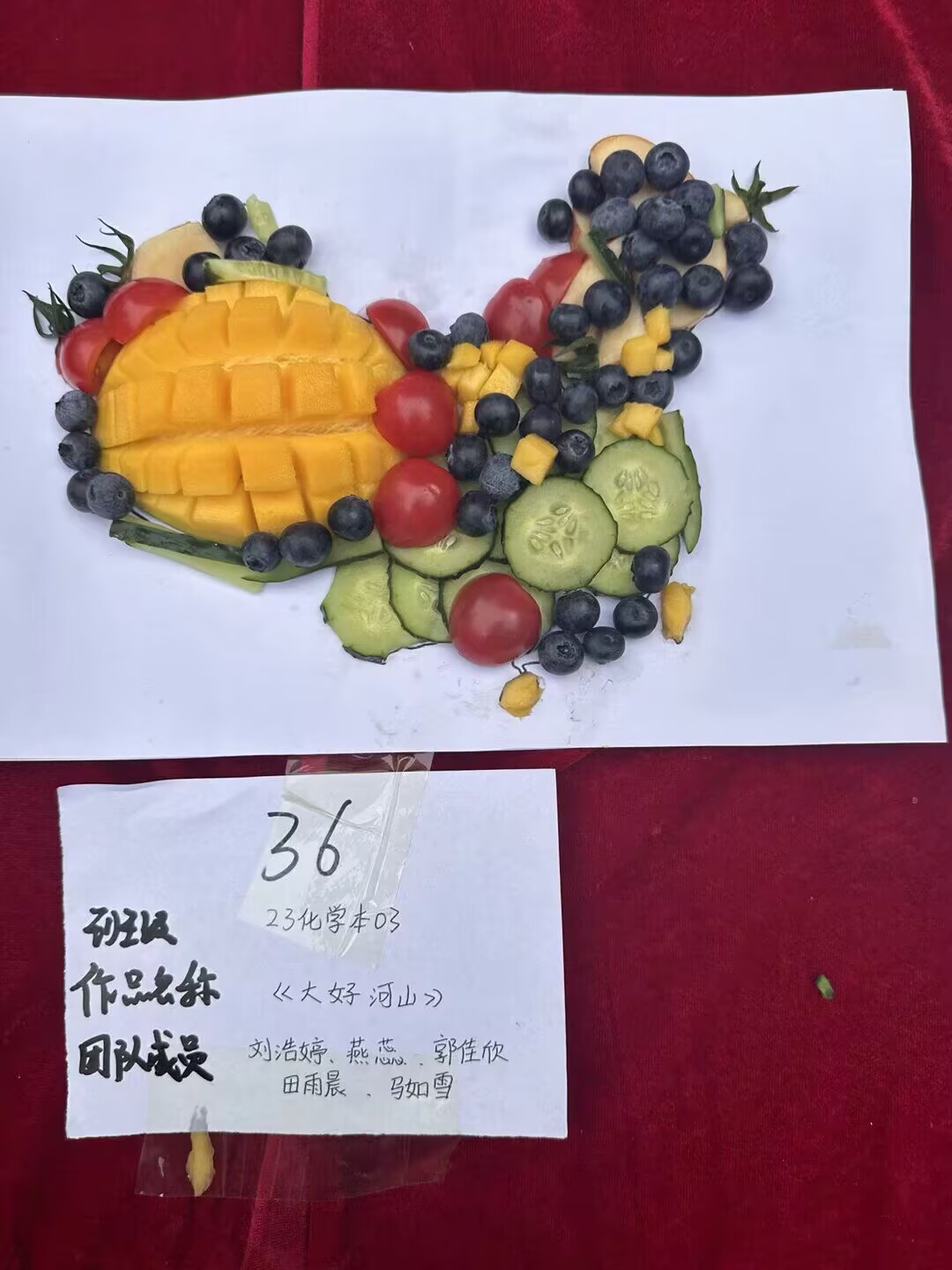 比赛过程中,同学们纷纷大显身手,充分发挥自己的创意与巧思。她们或专注雕刻,或精心摆盘,现场一片忙碌而有序的景象。有人将苹果雕成花篮,搭配色彩鲜艳的火龙果、蓝莓,宛如一幅绚丽的画卷;有人以橙子为原料,创作出可爱的玩偶造型,萌态十足;还有人将水果切片、塑形,拼出了盛世山河图寓意今日美好的幸福生活和强大的祖国,传递出对祖国的热爱。大家一边创作,一边交流心得,现场欢声笑语不断。