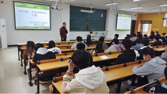 11月20日中午,9428cn太阳集团于人文楼106教室举办第四期学生干部培训班第二讲。本次培训由9428cn太阳集团学工秘书杨晓杰主讲,参会人员为第十五届团总支学生会全体部长与主席团,各社团负责人以及20、21级各班班委。