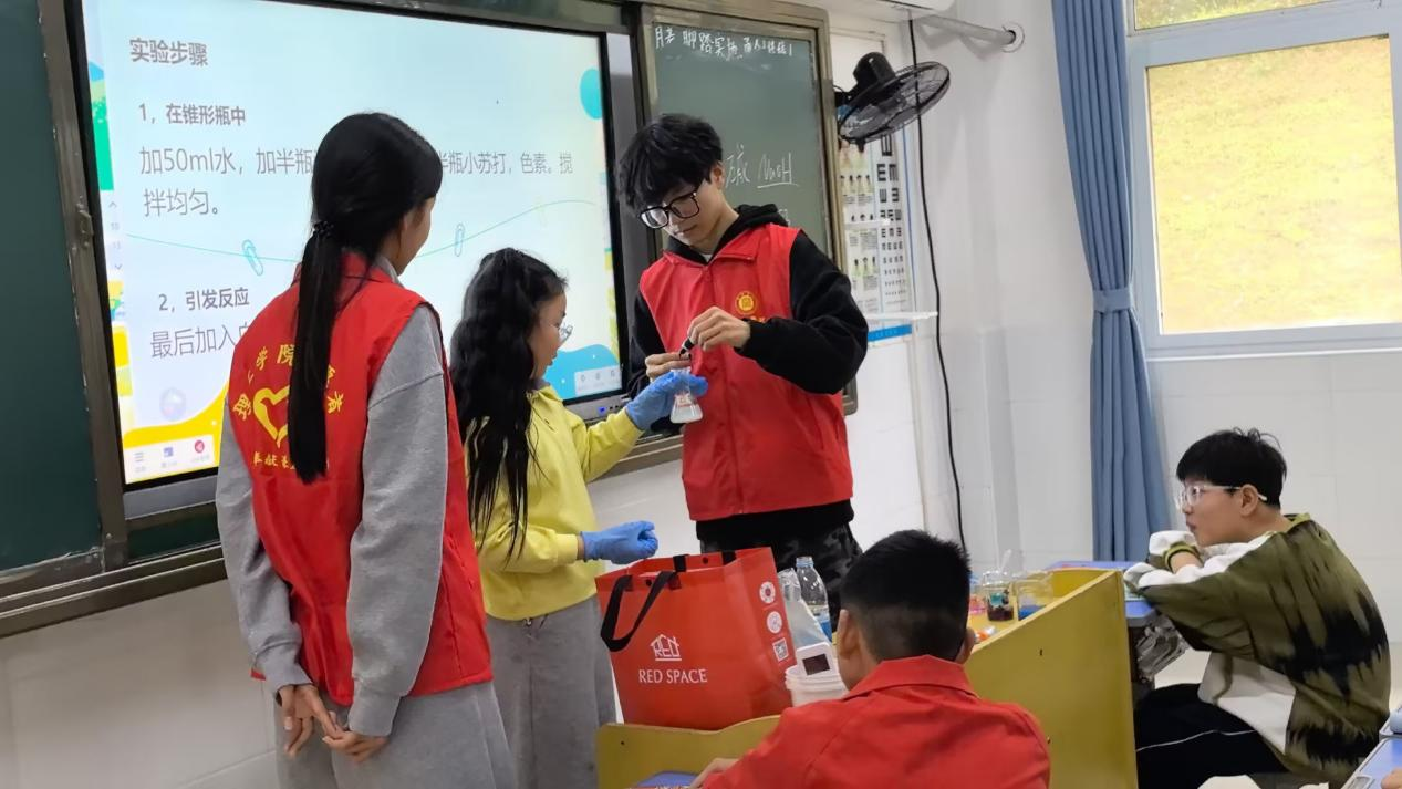 下午3时,志愿者们抵达校园,迅速布置好实验器材。色彩丰富的材料、安全有趣的装置立即吸引了同学们的目光。活动中,志愿者们依次展示了三大趣味化学实验:在“紫甘蓝变色实验”中,紫色液体遇酸变红、遇碱变蓝,让同学们直观感受酸碱反应的神奇;“蓝色云朵”实验里,白色硫酸铜晶体遇水变成蓝色溶液,再生成絮状沉淀,宛如云朵漂浮杯中;最受欢迎的“大象牙膏”实验将气氛推向高潮,大量蓬松泡沫喷涌而出,孩子们欢呼雀跃。
