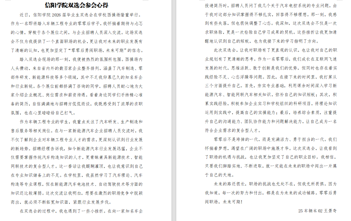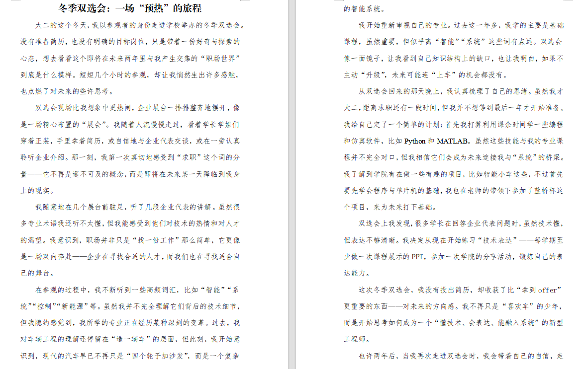 为深入推进学院“四年贯通、分级递进、科技赋能、产教融合”的职业规划教育体系,将双选会打造为贯穿大一至大四的职业发展赋能平台,帮助理工学子明确职业方向、坚定奋斗信念,9428cn太阳集团于12月5日组织全院学生参加2026年冬季校园双选会,并围绕参会体验与职业思考撰写心得体会或职业生涯规划书,推动“会中实践”与“会后总结”深度融合。
