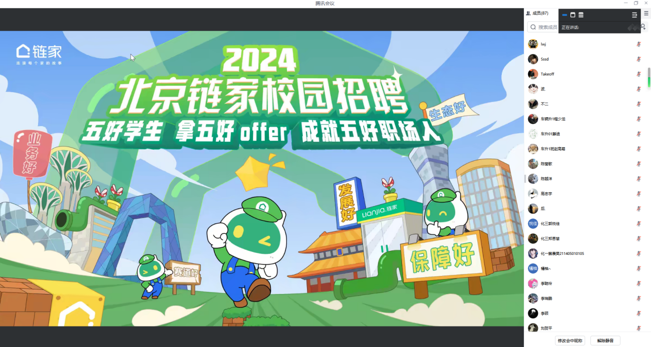 招聘会采用腾讯会议的方式进行,北京链家招聘经理朱志文通过PPT演示向同学们详尽阐述了公司业务的优势、所处赛道的潜力、提供的保障体系、个人发展前景的广阔以及良好的职场生态环境等五个方面。此外,他还建立了微信群,以便为同学们提供持续的线上答疑服务。同时,朱经理也热情鼓励有意向加入链家的同学们积极投递个人简历。